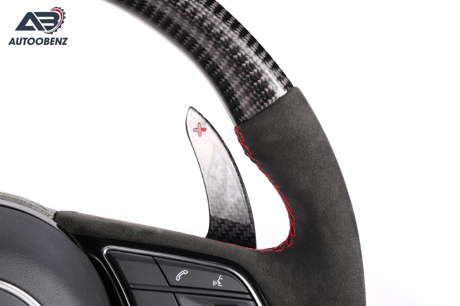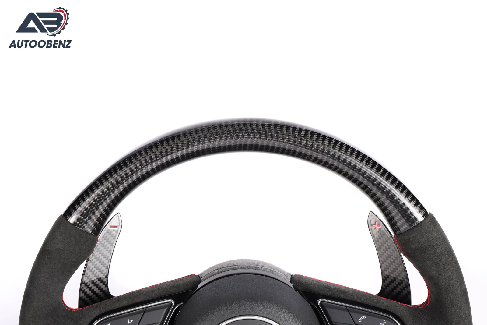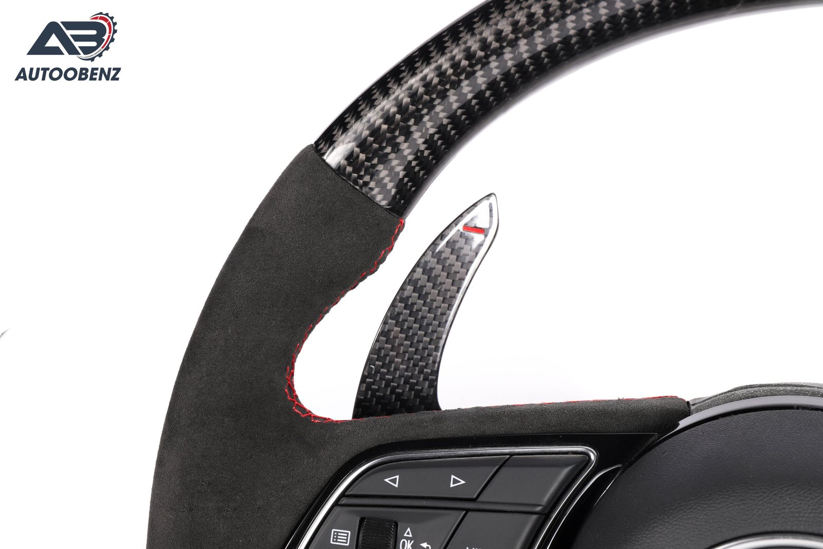 The Audi without a Ring Alcantara Carbon Fiber Steering Wheel V.1 is designed for drivers who value both aesthetics and functionality. Its luxurious Alcantara finish provides a premium feel, while the carbon fiber construction ensures durability and lightweight performance.